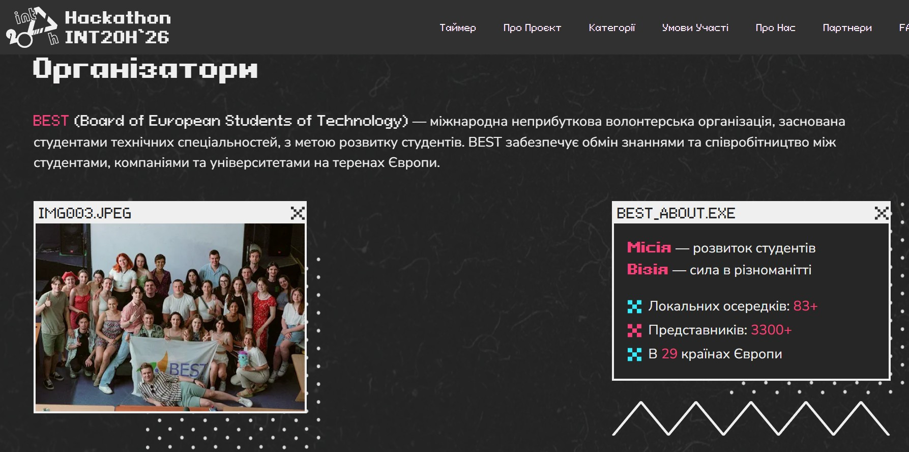 14-15 березня 2026 року відбувся INT20H Hackathon 2026 у Києві, який уже понад 10 років об'єднує молодих талановитих IT-розробників з усієї України. В рамках змагань студенти за 20 годин створюють інноваційні рішення, реалізують креативні ідеї, навчаються у провідних експертів та знаходять нові можливості для кар’єри.
