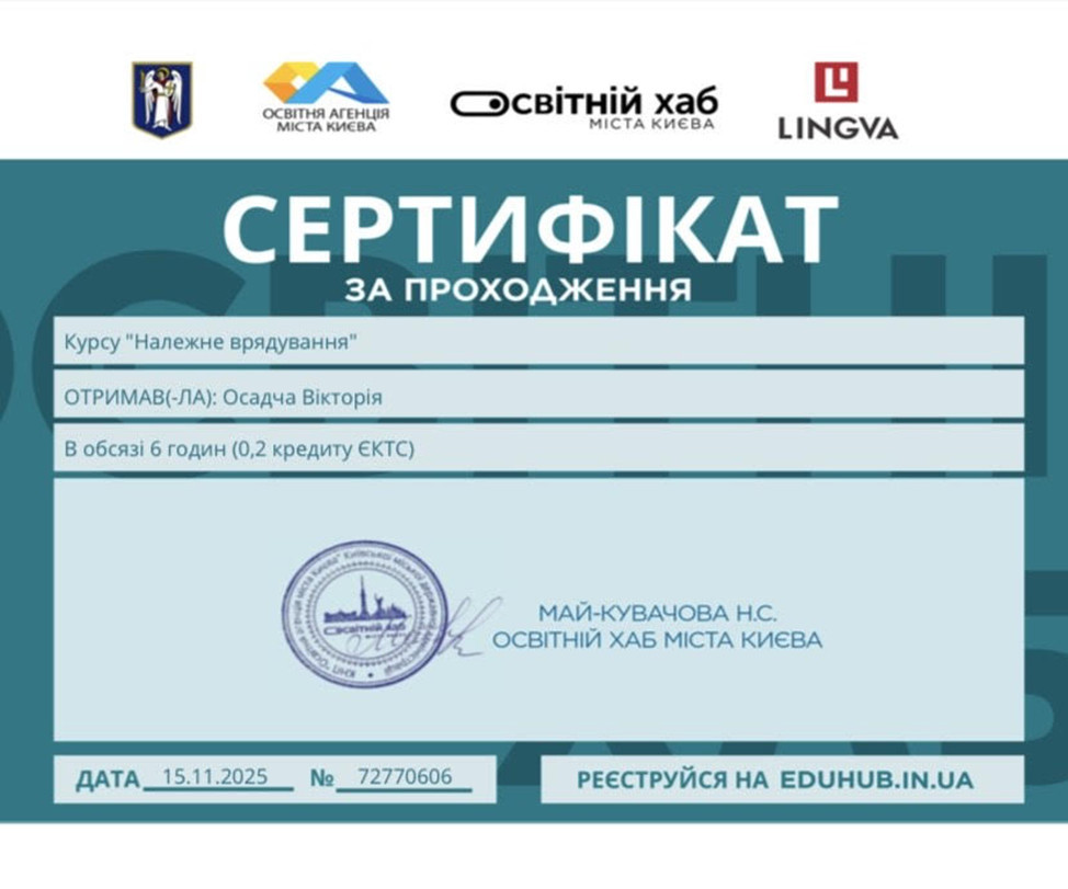 У період з 1 по 10 грудня у рамках вивчення дисципліни «Концептуальні засади публічного адміністрування», під керівництвом професора Юрія Кальниша, факультативно опанували навчальний курс «Належне врядування» здобувачі групи ПУАД-31: Михайло Авдеенко, Софія Борисова, Олександр Дановський, Ксенія Іващук, Олександр Крайзельбург, Вероніка Лук'яненко, Дмитро Макаренко, Максим Маліновський, Максим Молчанов, Вікторія Осадча, Анна Панчик, Софія Ременюк,  Єлизавета Тетерук, Дмитро Шарга.