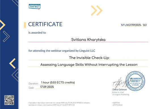 Отримані знання та практичні навички викладач планує інтегрувати у викладання дисципліни «Ділова іноземна мова» для студентів другого (магістерського) рівня вищої освіти освітньо-професійної програми «Менеджмент зовнішньо-економічної діяльності». Це надасть студентам можливість не лише вдосконалити професійну іншомовну комунікацію, а й опанувати сучасні цифрові інструменти для аналізу бізнес-середовища, розробки стратегій та організації власних стартапів англійською мовою.
