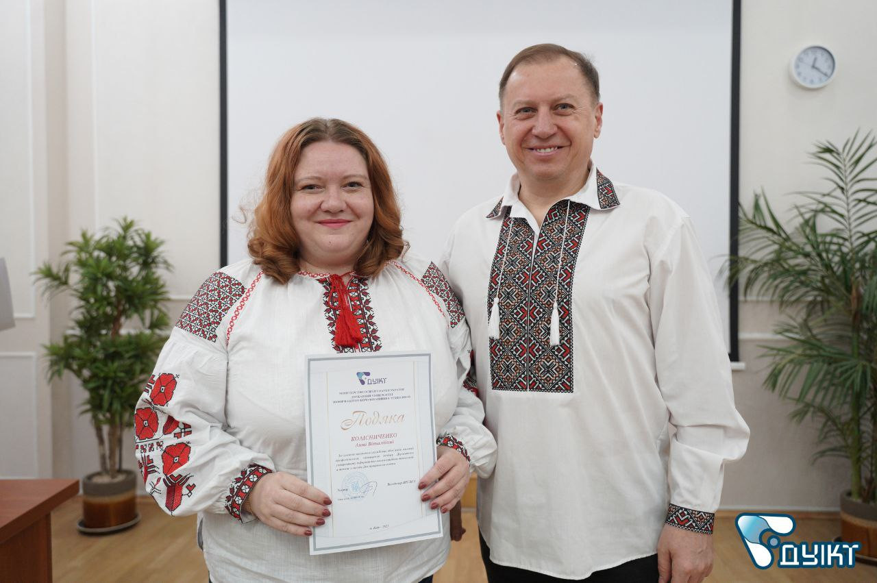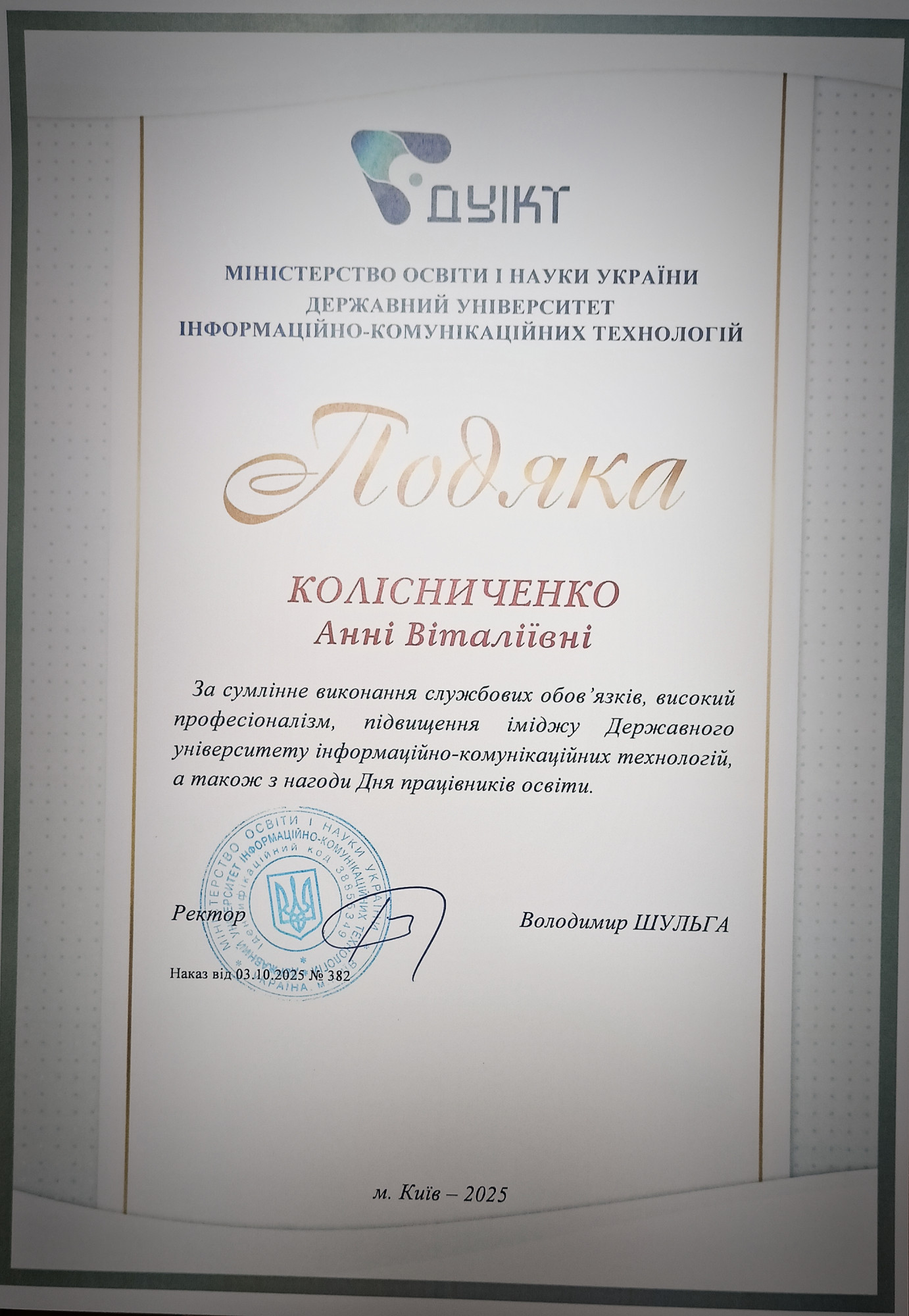 За сумлінну працю, зразкове виконання службових обов’язків, високий професіоналізм, підвищення іміджу ДУІКТ, а також з нагоди Дня працівника освіти ректор Володимир ШУЛЬГА вручив Подяку Анні КОЛІСНИЧЕНКО, завідувачці кафедри Англійської мови Навчально-наукового інституту телекомунікацій.