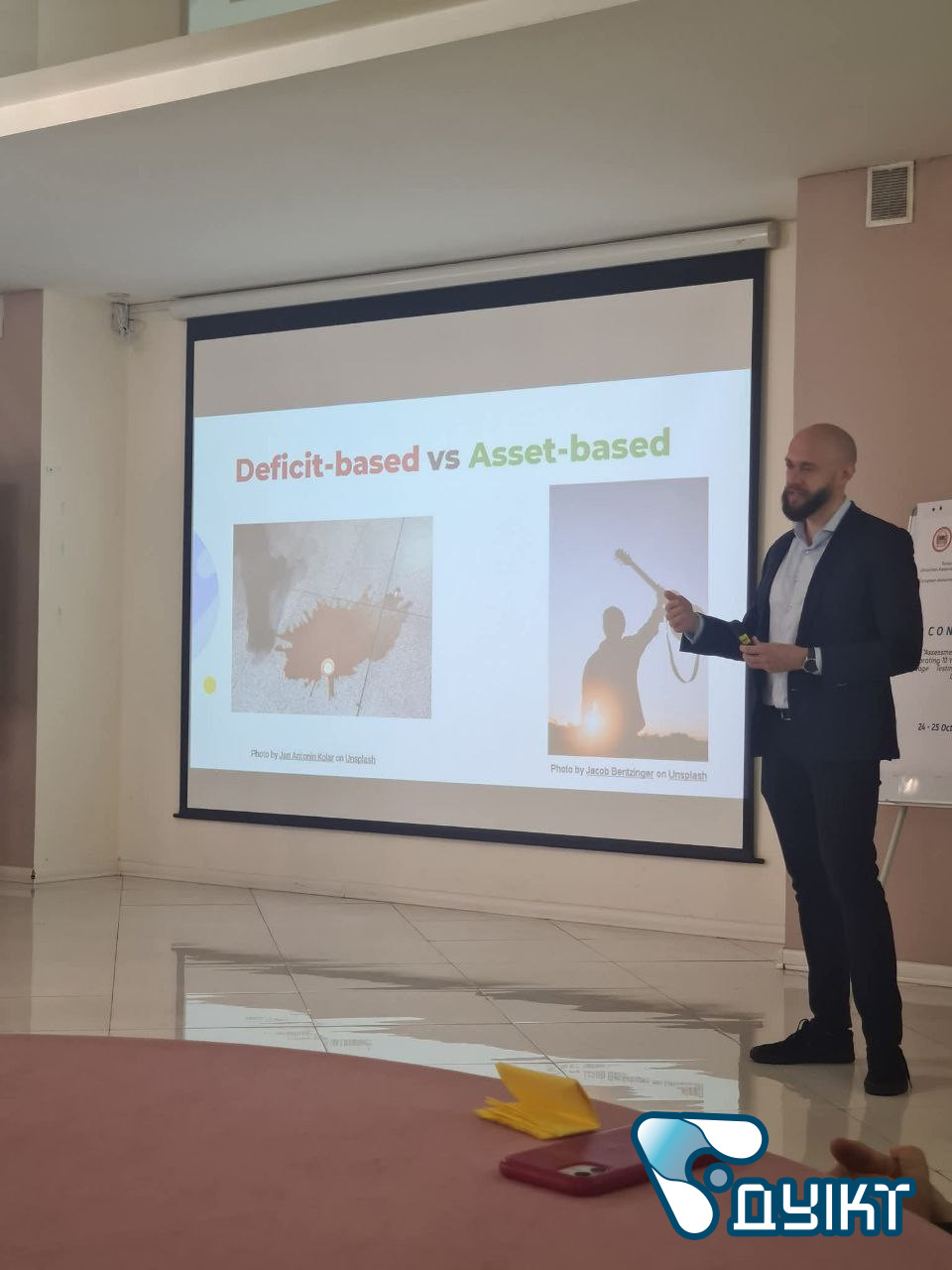 Під час другого дня конференції (25 жовтня) учасники взяли участь у низці змістовних сесій, серед яких особливу увагу привернула презентація Сергія Петренка (Київський національний університет імені Тараса Шевченка) на тему “Asset-based Approach to Assessment in ESP”. Доповідь була присвячена переосмисленню принципів оцінювання у викладанні англійської мови за професійним спрямуванням (ESP) через акцент на сильних сторонах здобувачів освіти, їхньому потенціалі та комунікативних досягненнях.