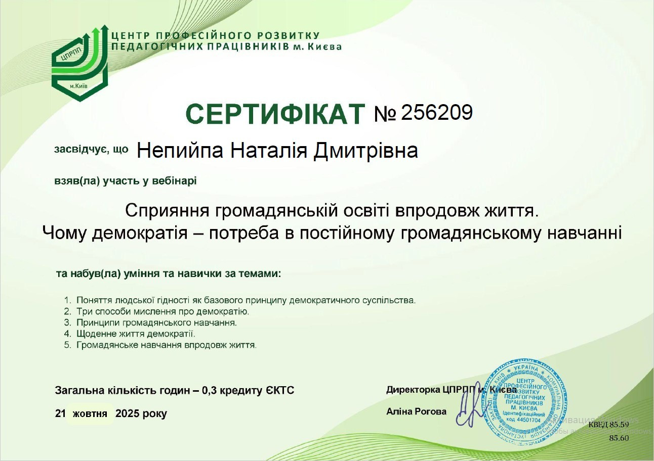 З метою поглиблення знань у сфері демократичної освіти старший викладач кафедри Англійської мови Навчально-наукового інституту телекомунікацій Наталія Непийпа взяла участь у міжнародному вебінарі «Сприяння громадянській освіті впродовж життя. Чому демократія – потреба в постійному громадянському навчанні», який відбувся 21 жовтня 2025 року.