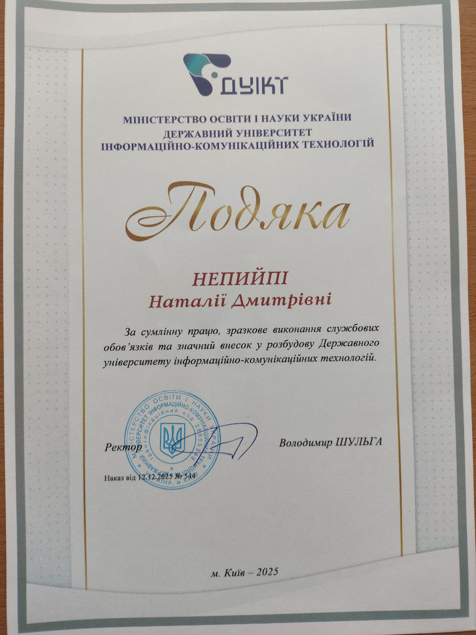 За сумлінну працю, зразкове виконання службових обов’язків та значний особистий внесок у розбудову університету ректором Володимиром ШУЛЬГОЮ оголошено подяку Наталії НЕПИЙПІ, старшому викладачу кафедри Англійської мови Навчально-наукового інституту телекомунікацій.