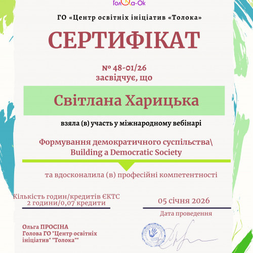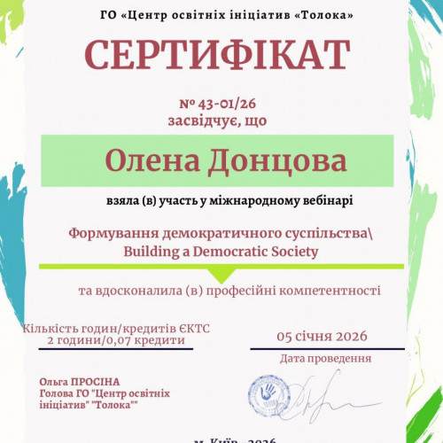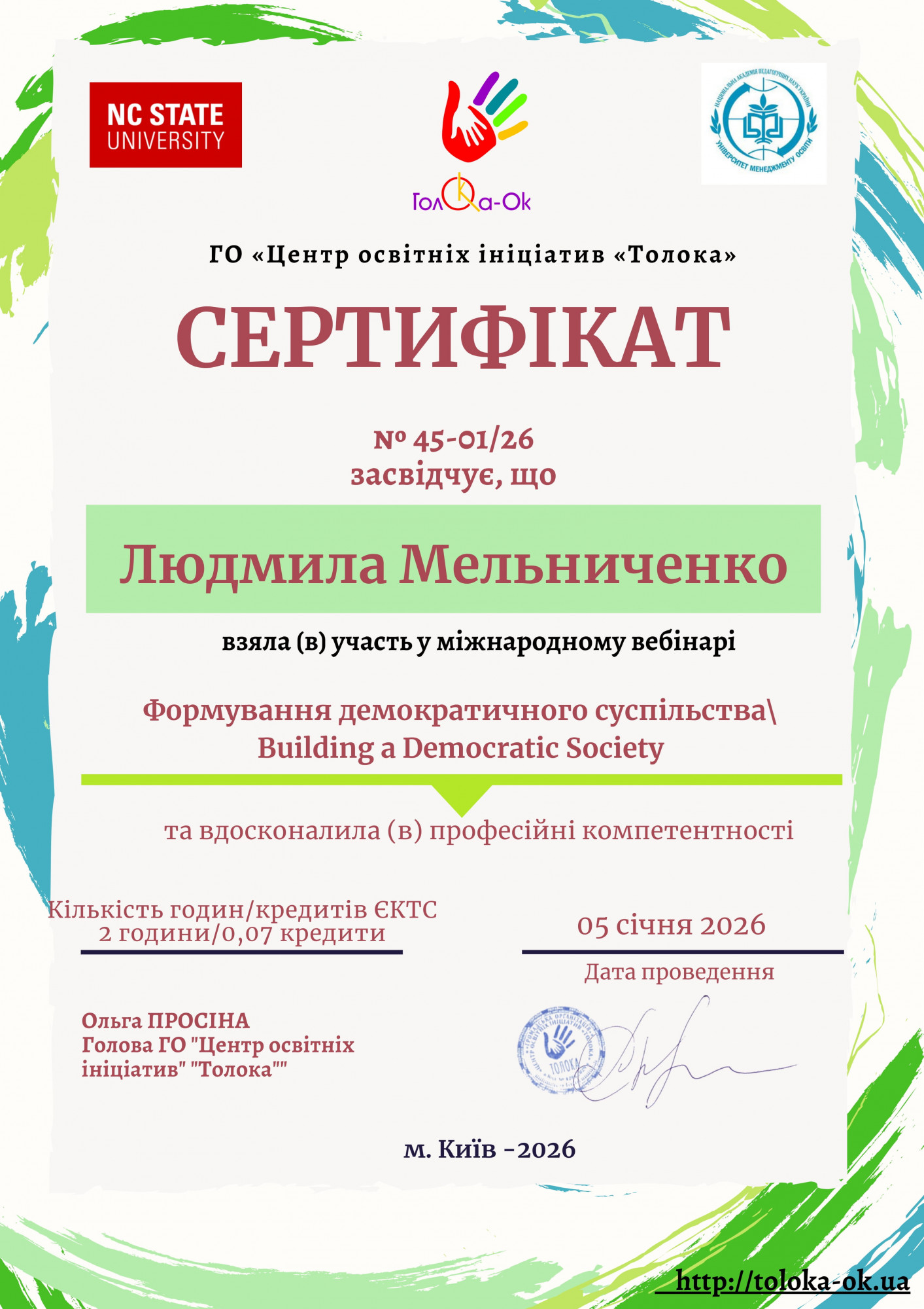 5 січня 2026 року викладачі кафедри Англійської мови та комп’ютерних лінгвотехнологій ННІІТ – Колісниченко Анна, Харицька Світлана, Мельниченко Людмила, Донцова Олена, Ніколаєва Анжеліка та Глуховська Наталія – долучилися до міжнародного вебінару «Формування демократичного суспільства», присвяченого ролі освіти у становленні демократичних цінностей.