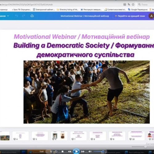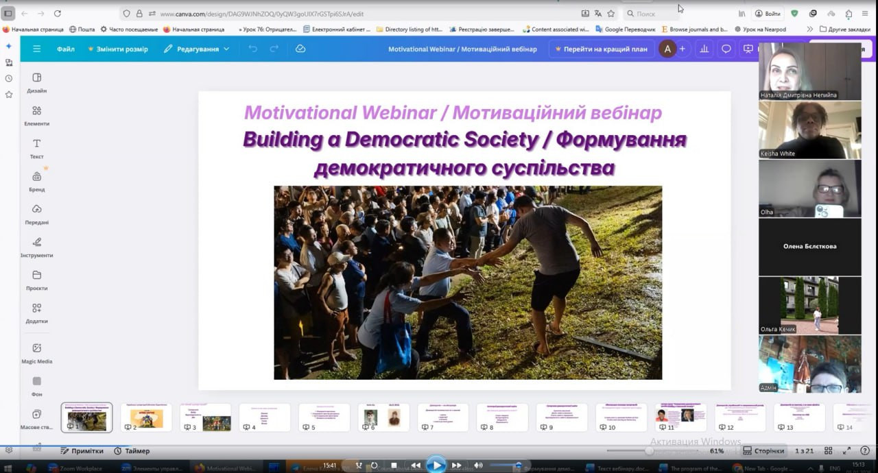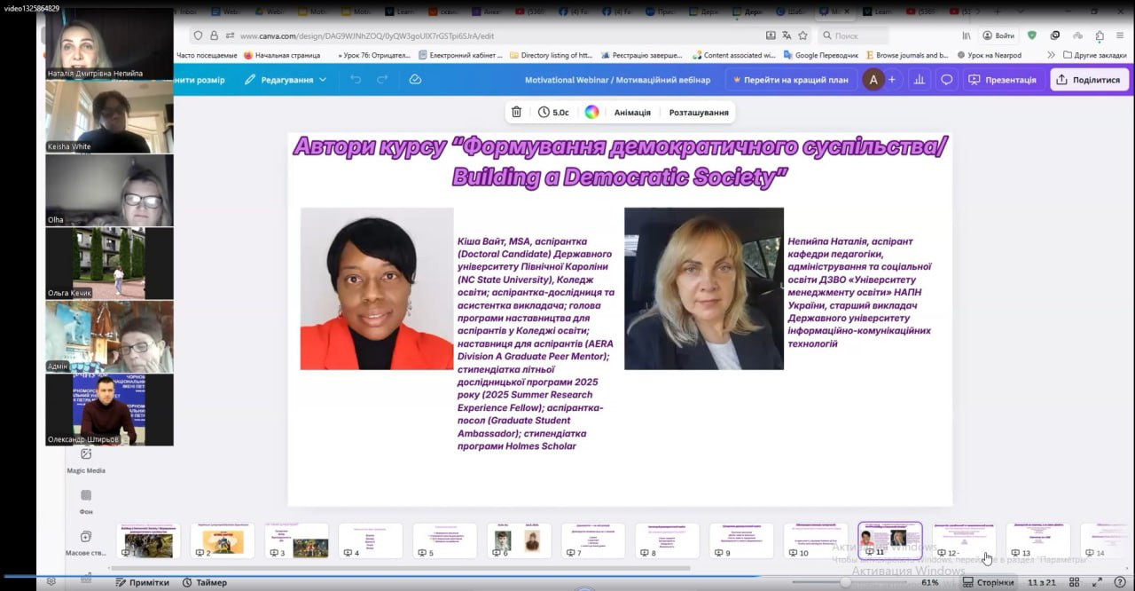 Особливу гордість викликає внесок старшого викладача кафедри Англійської мови та комп’ютерних лінгвотехнологій Непийпи Наталії – одним з двох співавторів та розробників програми курсу «Формування демократичного суспільства» та основного доповідача вебінару, інший співавтор курсу – Кіша Уайт. Вони представили свій курс, окресливши ключові та необхідність таких курсів для будь-якої демократичної країни, щоб зробити громадян більш обізнаними та активними у демократичних питаннях, що особливо важливо для нашої країни саме зараз, під час війни і захисту нашої свободи і незалежності.