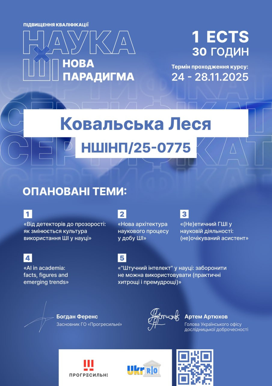 Підвищення кваліфікації науково-педагогічних працівників кафедри документознавства та інформаційної діяльності є неодмінною умовою організації якісної освітньої роботи. Окрім того, новітні тенденції розвитку інформаційних технологій засвідчують потребу йти в ногу з часом та активно впроваджувати новітні досягнення обробки інформації у науково-дослідну роботу. Особливо актуальним і затребуваним виявився масштабний курс ГО «Прогресильні» та Українського офісу дослідницької доброчесності «Наука ШІ: нова парадигма», який проходив з 24 по 28 листопада 2025 року.