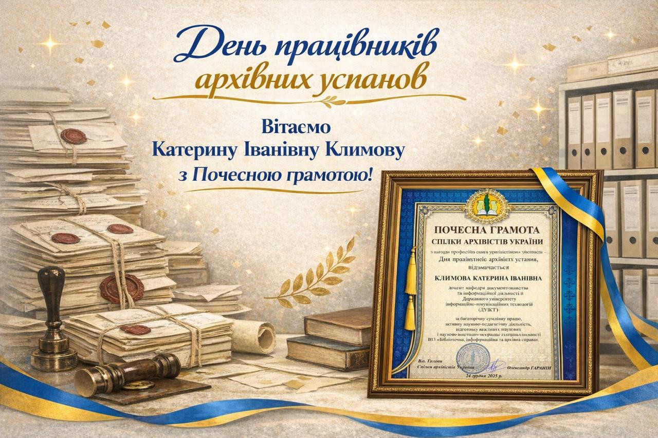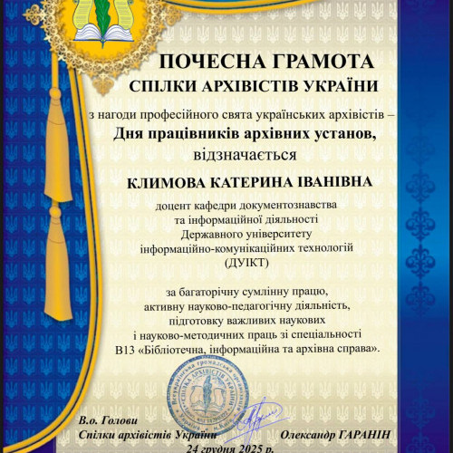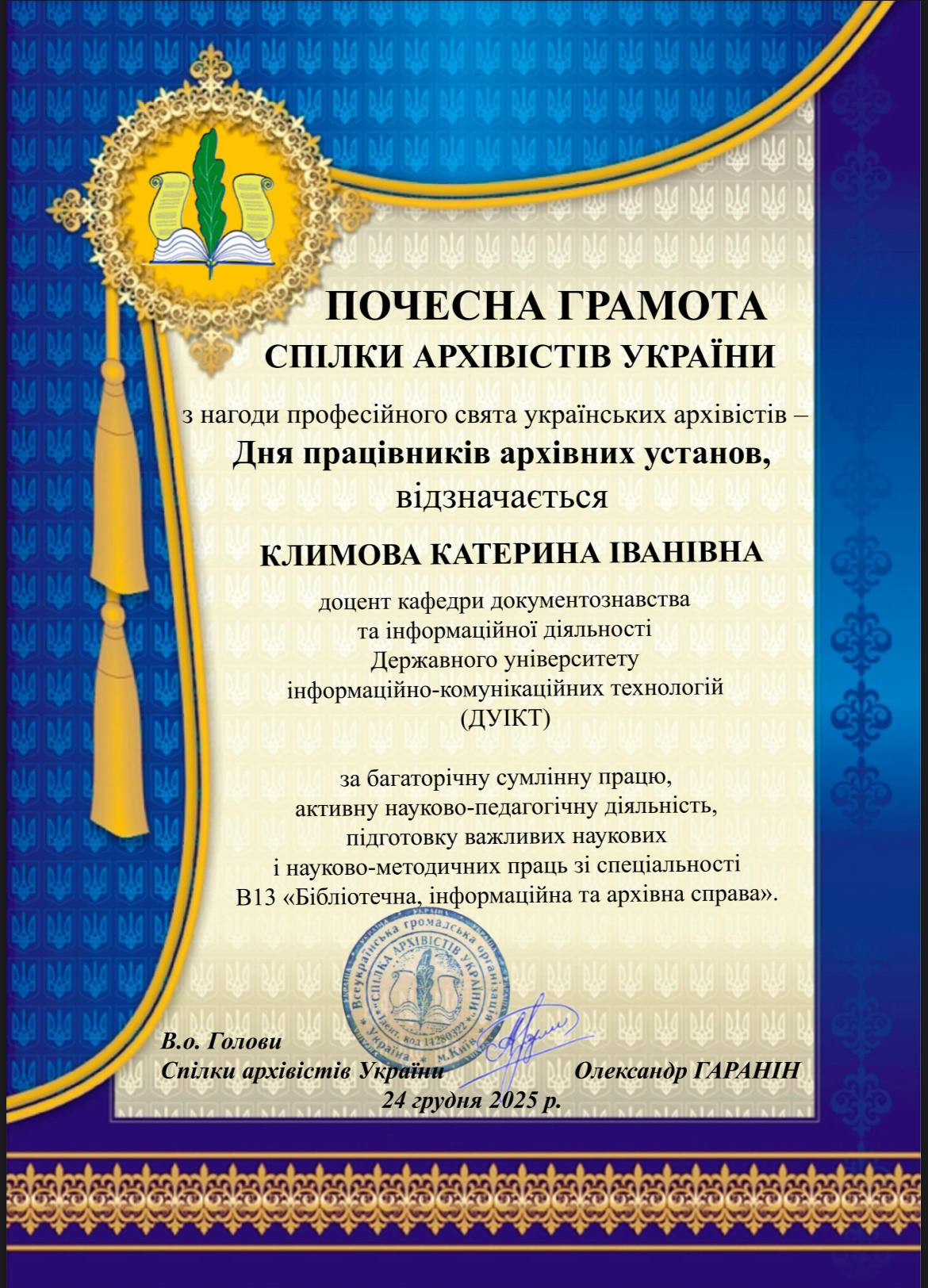 Колектив кафедри з особливою гордістю вітає доцента кафедри документознавства та інформаційної діяльності ДУІКТ Катерину Климову, чия багаторічна професійна та науково-педагогічна діяльність є прикладом високої фаховості, відданості справі та відповідального служіння науці й освіті. За сумлінну працю, активну науково-педагогічну діяльність, вагомий внесок у підготовку фахівців і розвиток спеціальності Б13 «Бібліотечна, інформаційна та архівна справа» Катерина Іванівна була відзначена Почесною грамотою Спілки архівістів України з нагоди Дня працівників архівних установ. Її професійні здобутки та особистий внесок надихають студентів і колег, сприяють розвитку архівної науки та утвердженню високих стандартів фахової підготовки.