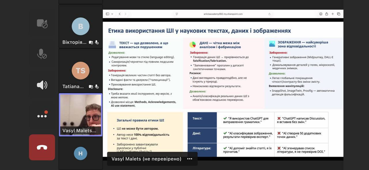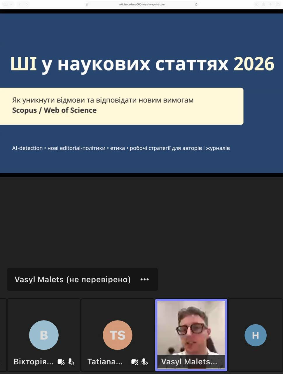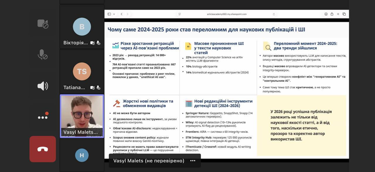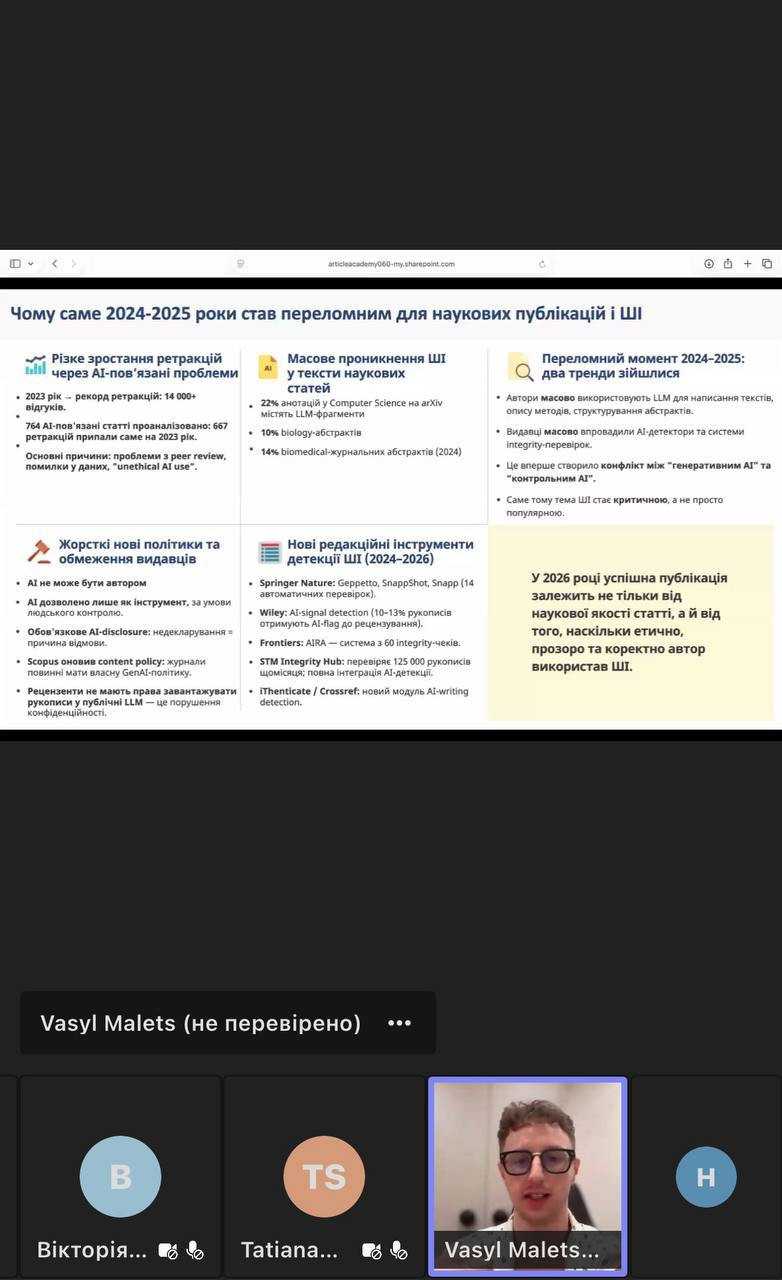 Під час заходу учасники ознайомилися з актуальними вимогами до використання штучного інтелекту в наукових публікаціях, розглянули основні причини відмов у міжнародних наукових журналах, а також опанували практичні підходи до підготовки статей з урахуванням оновлених правил 2026 року.