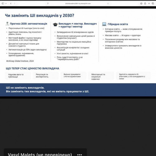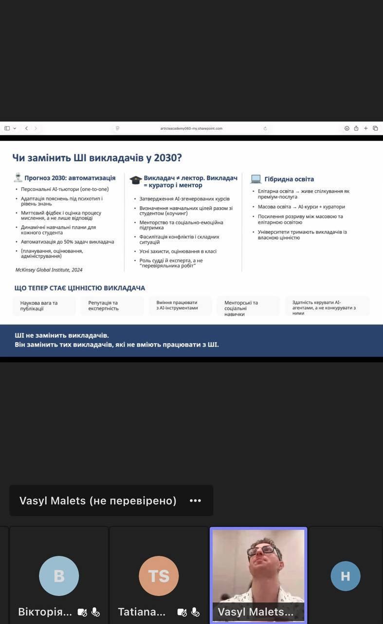 «Участь наших викладачів у вебінарі з питань використання штучного інтелекту в наукових публікаціях є важливим кроком до підвищення якості досліджень та відповідності міжнародним стандартам. Сьогодні надзвичайно важливо не лише володіти сучасними цифровими інструментами, а й відповідально та доброчесно застосовувати їх у науковій діяльності. Отримані знання допоможуть нашим науковцям успішно готувати публікації відповідно до вимог 2026 року та гідно представляти результати роботи кафедри у провідних міжнародних виданнях».