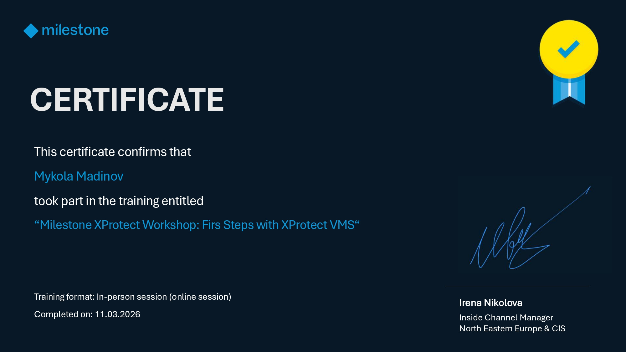11 березня 2026 року аспірант кафедри Мобільних та відеоінформаційних технологій Микола Мадінов успішно пройшов спеціалізований онлайн-воркшоп організований компанією Milestone Systems. Захід дав можливість систематизувати базові знання перед наступними етапами підготовки та сертифікації.