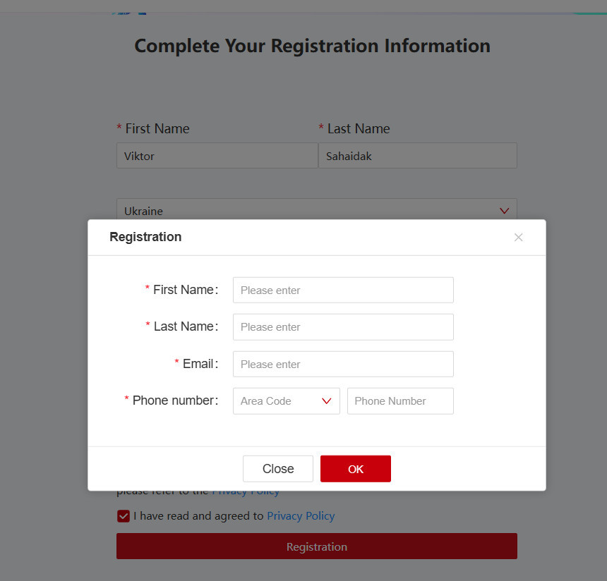 Натискаєте погодження з «I have read and agreed to Privacy Policy» та кнопку «Registration»