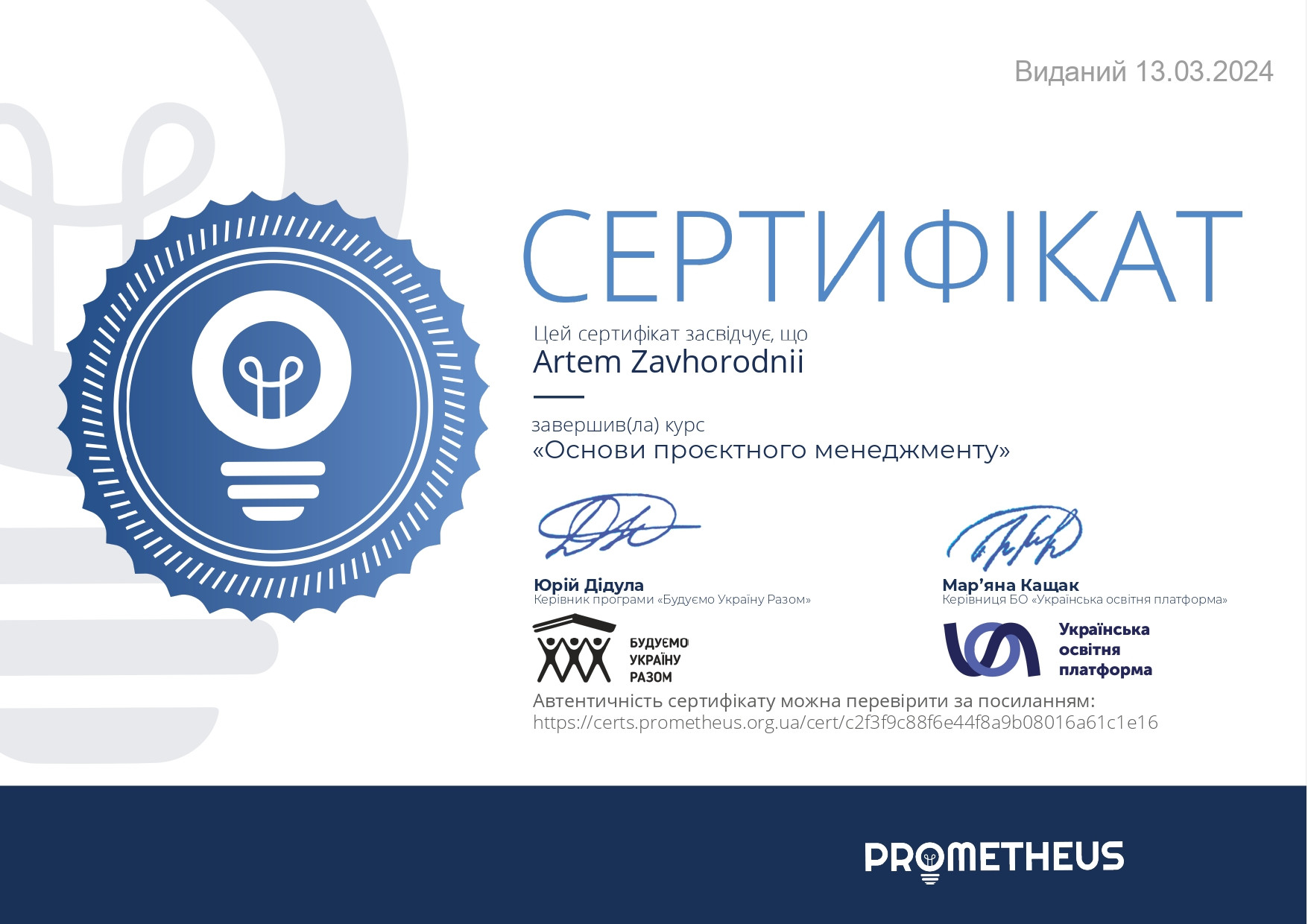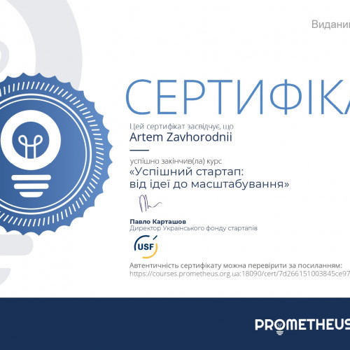 Здобувач освітньо-наукового ступеня доктора філософії за спеціальністю 073 «Менеджмент» Артем Завгородній успішно пройшов навчання на освітній онлайн-платформі та отримав сертифікати за курсами «Успішний стартап та ідеї масштабування» та «Основи проєктного менеджменту». У межах навчання здобувач поглибив знання щодо формування та розвитку інноваційних бізнес-ідей, стратегій масштабування, а також сучасних підходів до планування, реалізації та контролю проєктів.