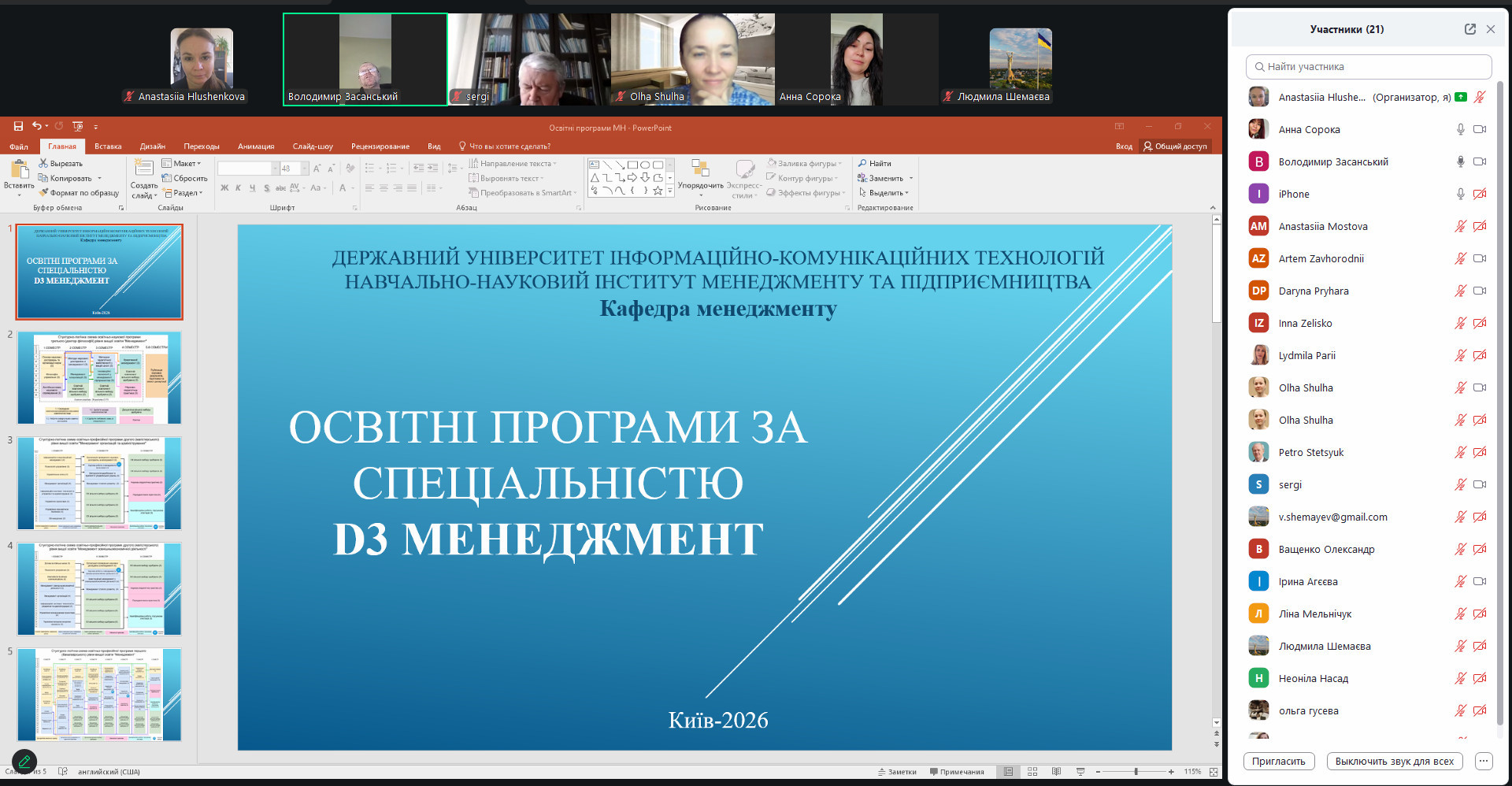 На кафедрі Менеджменту Державного університету інформаційно-комунікаційних технологій відбулося публічне обговорення проєктів освітніх програм за спеціальністю D3 «Менеджмент» галузі знань D Бізнес, адміністрування та право, які будуть введені в дію у 2026-2027 навчальному році.