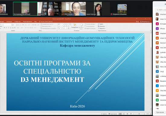 На кафедрі менеджменту Державного університету інформаційно-комунікаційних технологій відбулося онлайн-обговорення проєкту Освітньо-наукової програми «Менеджмент» третього (освітньо-наукового) рівня вищої освіти за спеціальністю D3 «Менеджмент» (освітня кваліфікація – доктор філософії з менеджменту).