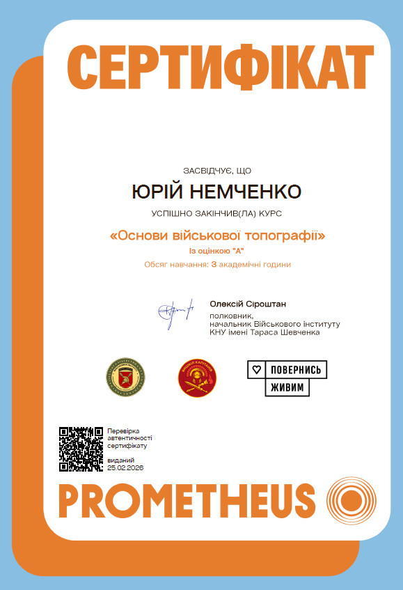 У лютому 2026 року доцент кафедри Психології, здоров’я та безпеки людини Навчально-наукового інституту кібербезпеки та захисту інформації Юрій Немченко успішно завершив навчання за програмою «Основи військової топографії» на освітній платформі Prometheus.