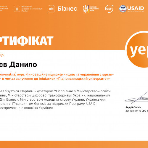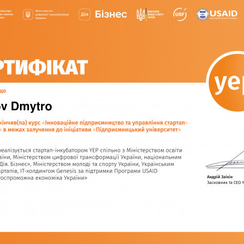 У межах вибіркової дисципліни «Інноваційне підприємництво та управління стартап-проєктами» студенти 2 курсу освітньої програми «Технології цифрового розвитку» успішно завершили навчальний модуль «Підприємницький університет» та отримали іменні сертифікати мережі YEP, що засвідчують набуття практичних компетентностей у сфері інноваційного підприємництва, управління стартап-проєктами і створення бізнес-моделей.