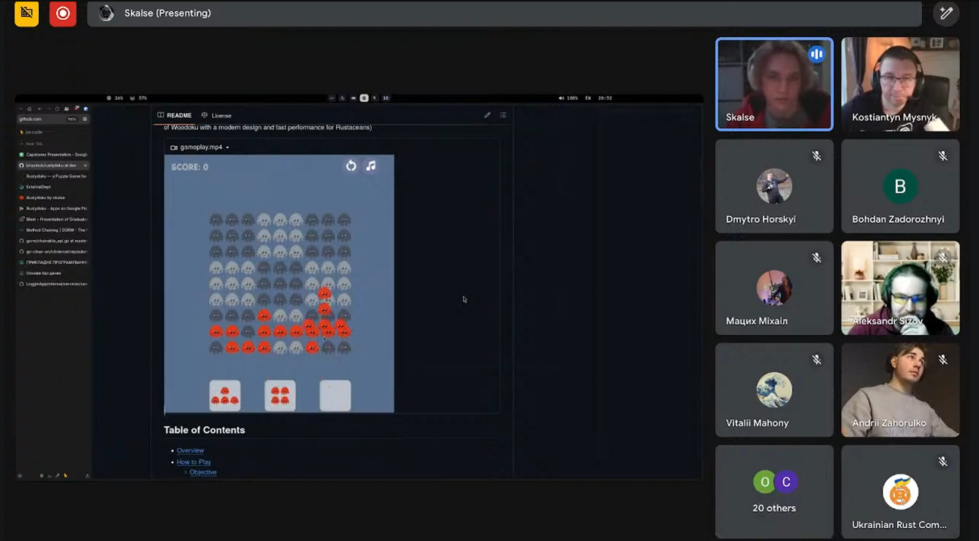 У межах буткемпу він також реалізував власний проєкт “A Rust-based game inspired by Woodoku, combining modern design with fast performance for puzzle enthusiasts” — гру-головоломку на основі Rust, що поєднує сучасний дизайн і високу продуктивність. Проєкт був представлений під час підсумкової події Capstone Projects Presenting | Graduators of the Rustcamp Winter 2025, організованої Ukrainian Rust Community.
