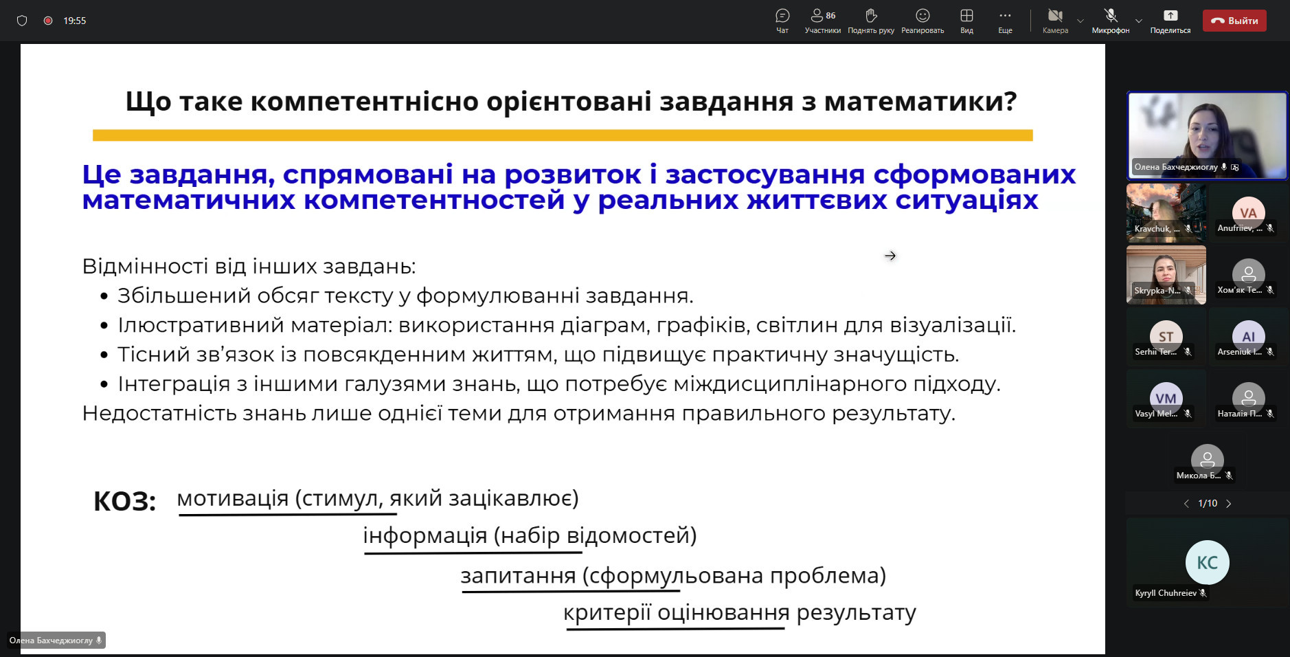 Олена Бахчеджиоглу — докторка філософії (PhD) зі статистики, викладачка математики та авторка освітніх курсів — представила лекцію на тему «Компетентнісний і діяльнісний підходи в освіті: прикладна і життєва математика», зосередивши увагу на практичному застосуванні математичних знань.