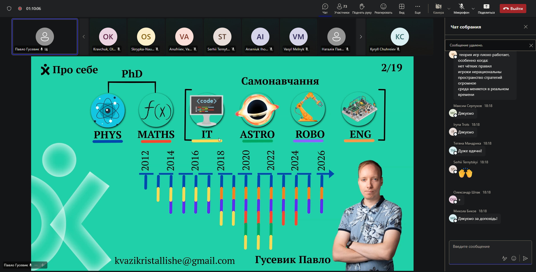 Також з доповіддю виступив Павло Гусевик — доктор філософії (PhD) з фізики, науковий керівник учнівських інженерних проєктів, який презентував тему «Як створити центр науки у школі або досвід підготовки переможців Олімпіади Геніїв».