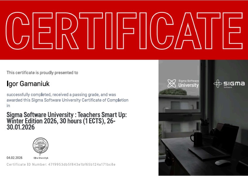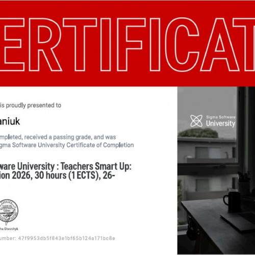 З 26 по 30 січня 2026 року викладачі кафедри Інженерії програмного забезпечення в межах освітніх ініціатив, спрямованих на підвищення професійної кваліфікації долучитися до навчальної програми в Teacher’s Smart Up: Winter Edition 2026 від компанії Sigma Software. На даному курсі викладачі ІТ-дисциплін мали змогу поглибити свої знання в сучасних ІТ-напрямках, отримати практичні навички, а також вдосконалити свої компетенції в організації освітнього процесу, прослухавши лекції та задавши питання спікерам, серед  яких: