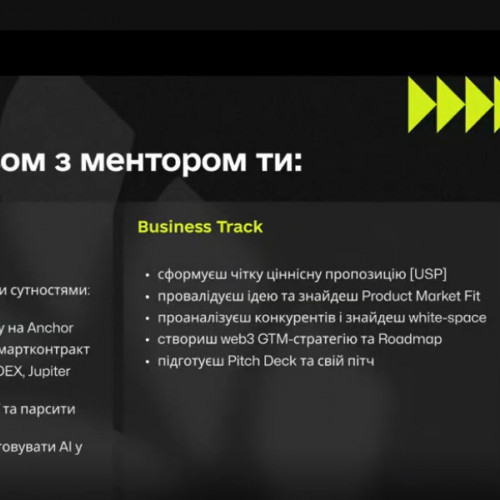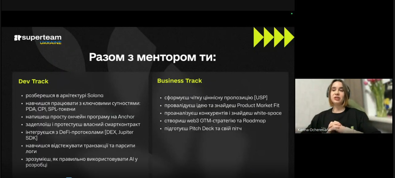 Другий напрям – Dev-трек – орієнтований на студентів-програмістів, які мають базові знання у сфері блокчейн-технологій. Учасники цього треку вивчають особливості програмування для блокчейн-екосистеми Solana та разом із менторами розробляють смартконтракти для власних проєктів, отримуючи практичний досвід створення децентралізованих застосунків і Web3-рішень.