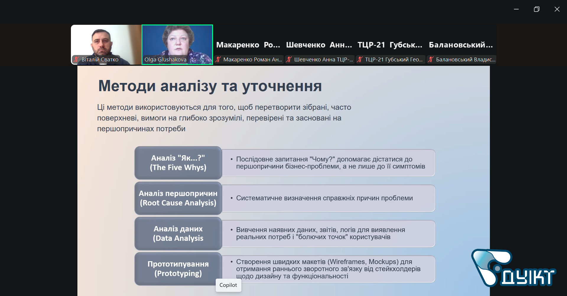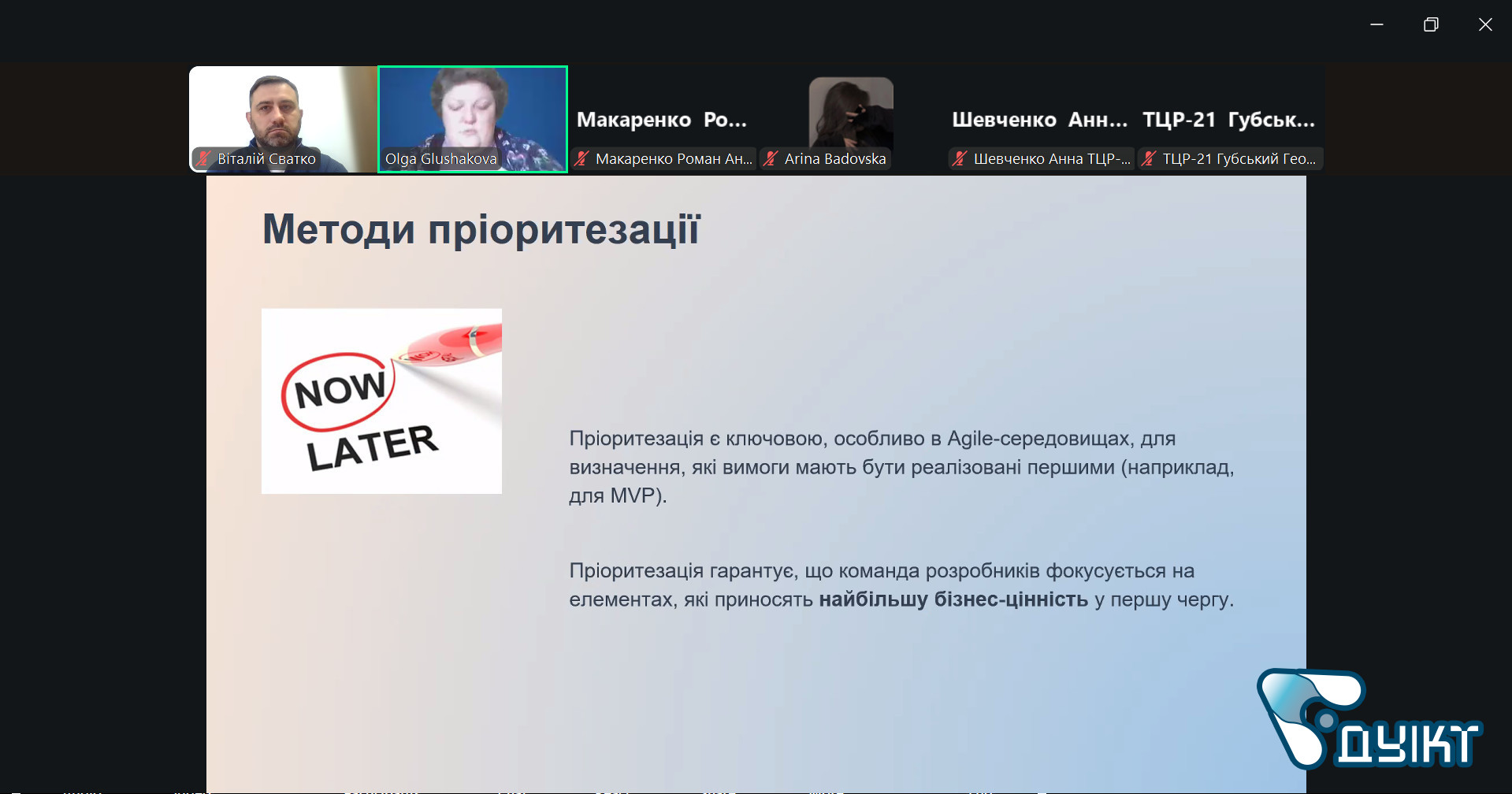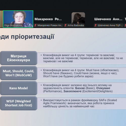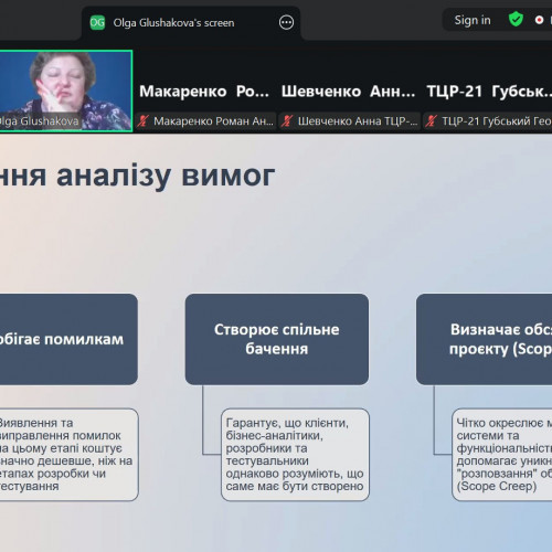 Під час лекції спікер детально розповіла студентам про сутність і завдання аналізу вимог, ознайомила з основними методами аналізу та підходами до пріоритезації вимог у сучасних проєктах. Ольга Глушакова наголосила, що грамотна робота з вимогами є ключовим етапом життєвого циклу розробки програмного забезпечення, адже саме від її якості залежить успішність усього проєкту.