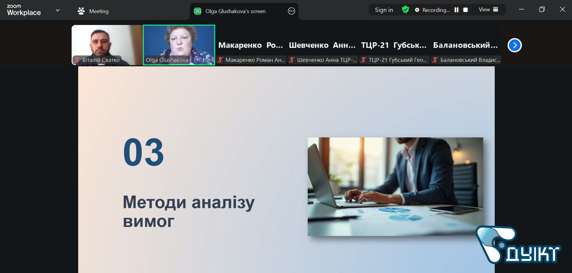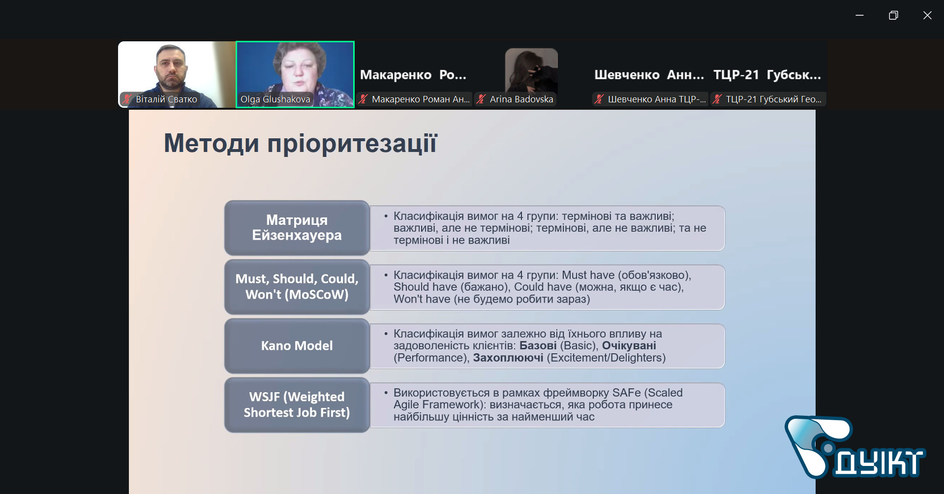 У межах вивчення дисципліни «Аналіз вимог до програмного забезпечення», яку на кафедрі Технологій цифрового розвитку викладає Віталій Сватко, відбулася гостьова лекція від Ольги Глушакової, Senior Business Analyst компанії Transporeon.
