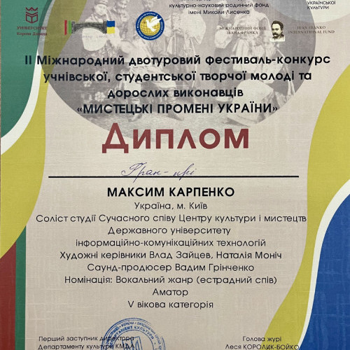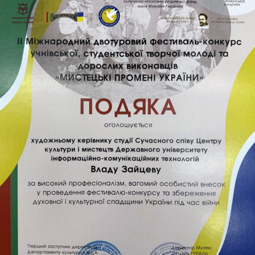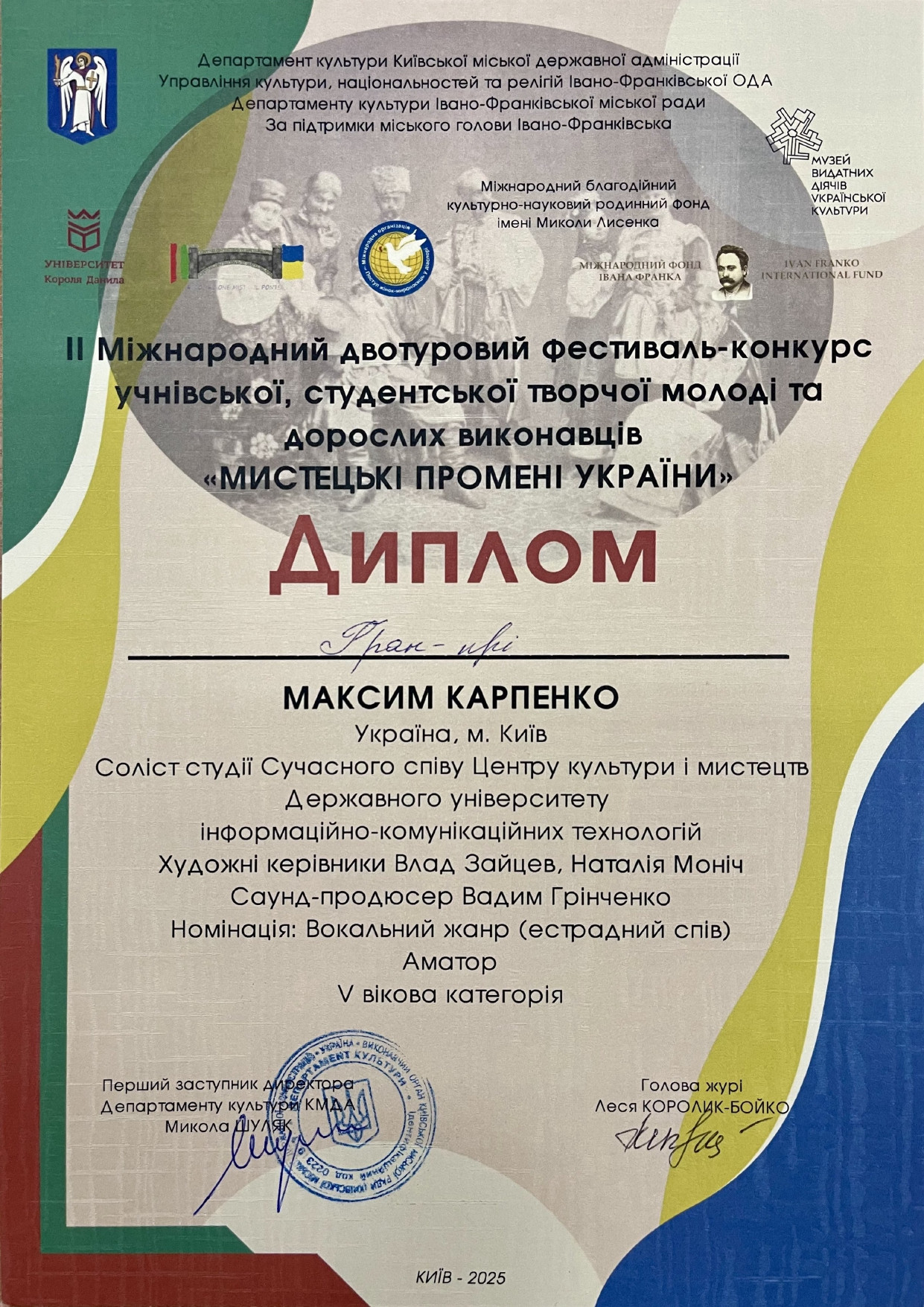 Через мистецтво учасники транслювали силу української ідентичності в умовах війни, демонструючи єдність, талант і духовну стійкість нашого народу. Особливу увагу членів журі привернули виступи студентів Державного університету інформаційно-комунікаційних технологій — солістів студії сучасного співу Центру культури  та мистецтв ДУІКТ Гран-прі фестивалю здобув Максим Карпенко, а Данило Гущин отримав диплом лауреата ІІ ступеня. Обидва — учасники V вікової категорії, які продемонстрували рівень, гідний професійної сцени.