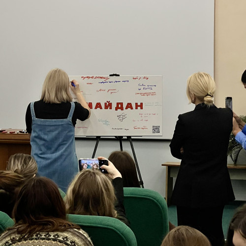 Під час лекції-зустрічі студенти згадали, як 21 листопада 2013 року, після рішення уряду призупинити підготовку до підписання Угоди про асоціацію з ЄС, молодь вийшла на мирний протест, що став початком масштабного руху за свободу та європейський вибір України.