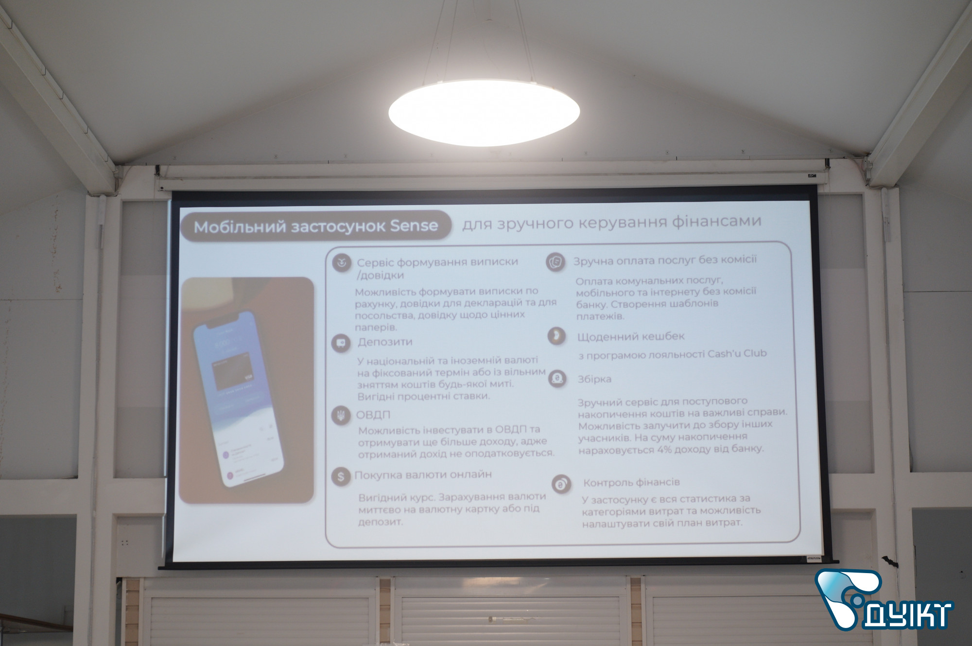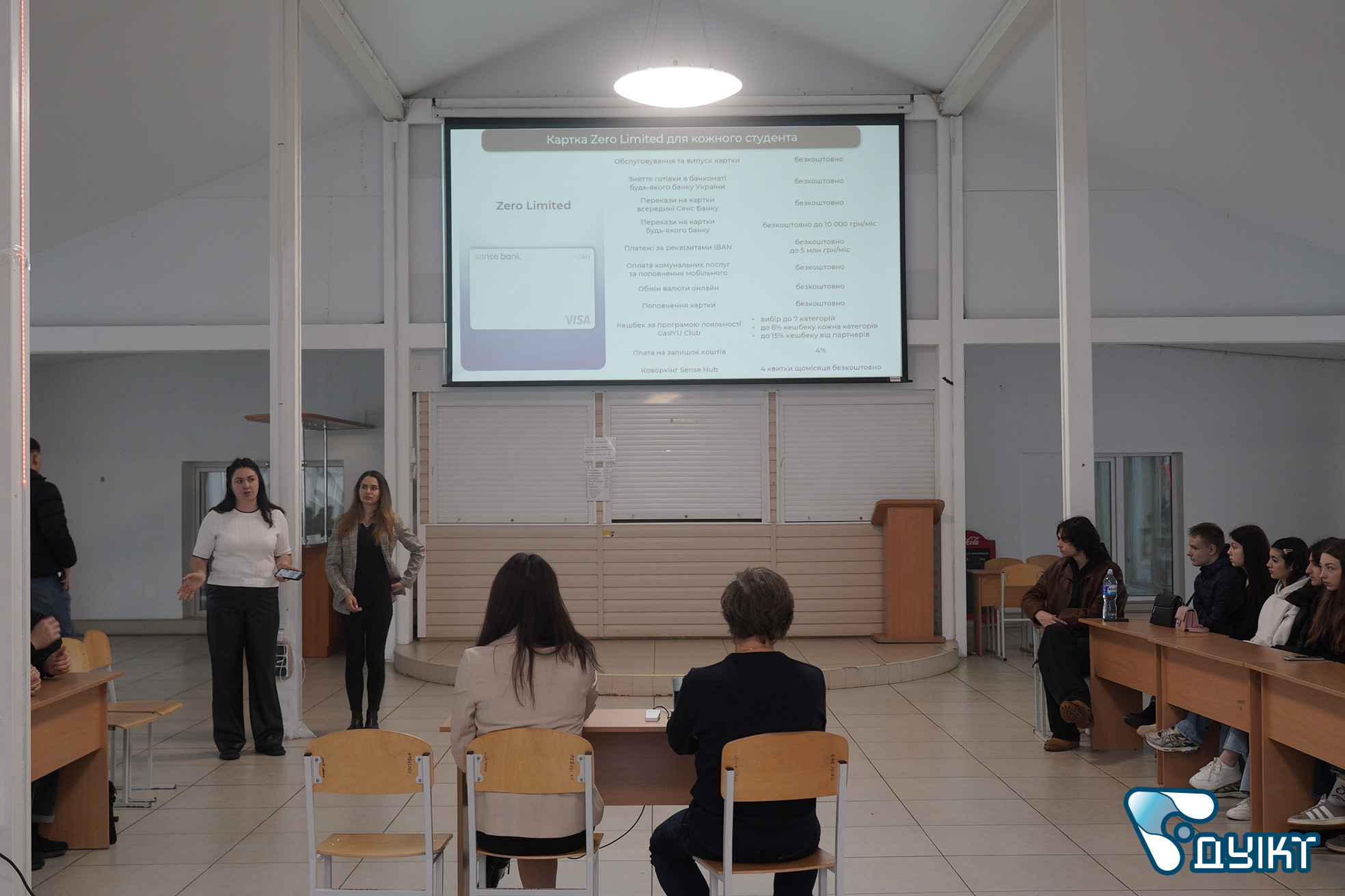 У Державному університеті інформаційно-комунікаційних технологій відбулася важлива зустріч студентів із представниками АТ Sense Bank, під час якої банк — офіційний партнер ДУІКТ — презентував спеціально розроблену карткову програму для студентів університету.