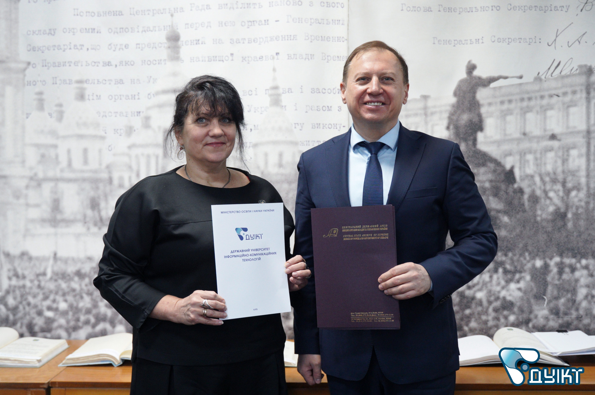 У четвер, 4 грудня в Центральному державному архіві вищих органів влади та управління України відбулася офіційна зустріч представників Державного університету інформаційно-комунікаційних технологій та Державної архівної служби України. В рамках зустрічі сторони підписали угоду про співробітництво.