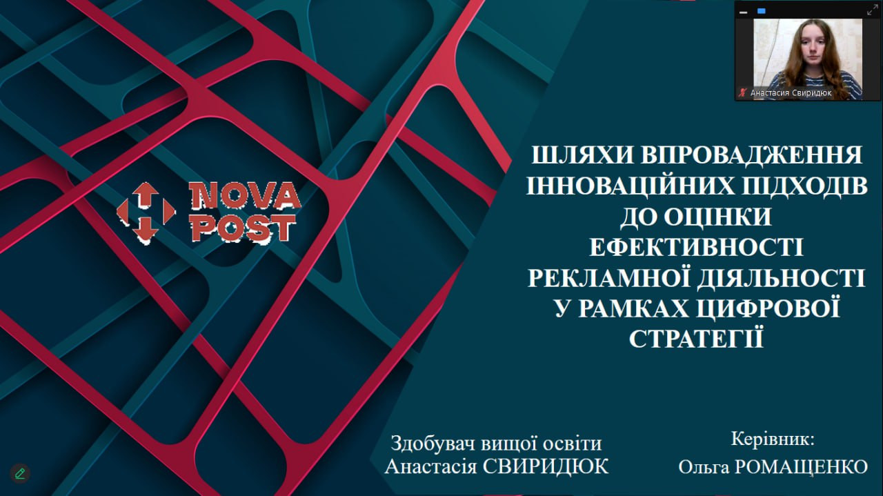 Здобувачка вищої освіти магістерського рівня спеціальності «Маркетинг» ОП «Міжнародний маркетинг» Анастасія Свиридюк, яка виконала роботу на тему «Шляхи впровадження інноваційних підходів до оцінки ефективності рекламної діяльності у рамках цифрової стратегії», отримала диплом ІІ ступеня (керівник: к.е.н., доц. Ромащенко О.С.). Анастасія продемонструвала високий рівень підготовки та значний науковий потенціал. Це також висока оцінка актуальності та практичної значущості досліджень, які проводяться на кафедрі маркетингу ДУІКТ.