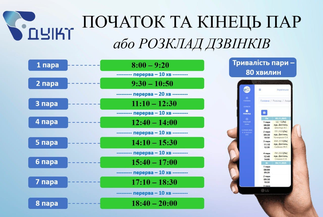 Актуальний розклад занять також доступний на сайті https://e-rozklad.duikt.edu.ua/.