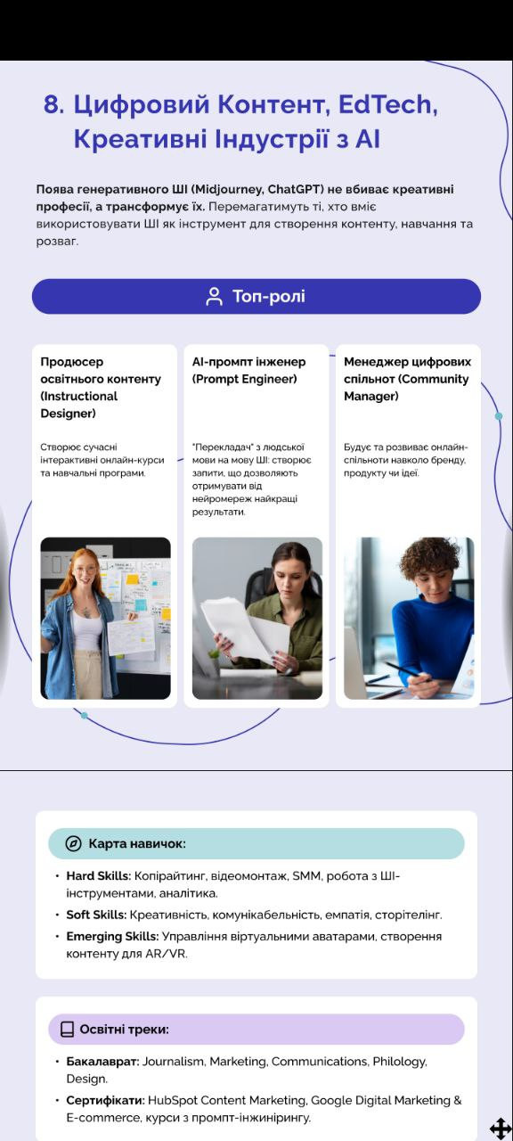 Особливої уваги заслуговує презентований каталог «Професії 2030: стратегічний гайд для шкіл та освітніх команд», який ґрунтовно окреслює зростання значення філології у сферах цифрового контенту, EdTech, креативних індустрій та AI. Згідно з міжнародними аналітичними документами щодо професій майбутнього, мовні, комунікативні та культурні компетентності стають критично важливими для роботи з генеративним штучним інтелектом, створення якісного контенту, міжкультурної комунікації та етичного використання технологій.