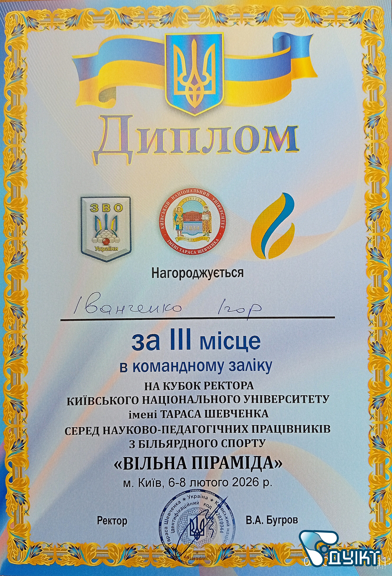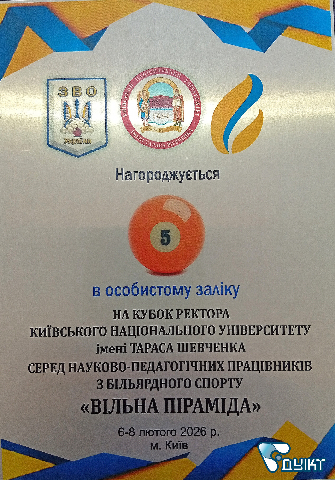 7–8 лютого 2026 року в Києві відбулися Всеукраїнські благодійні змагання з більярдного спорту — «Кубок Ректора Київського національного університету імені Тараса Шевченка серед науково-педагогічних працівників» у дисципліні «Вільна піраміда» з продовженням.